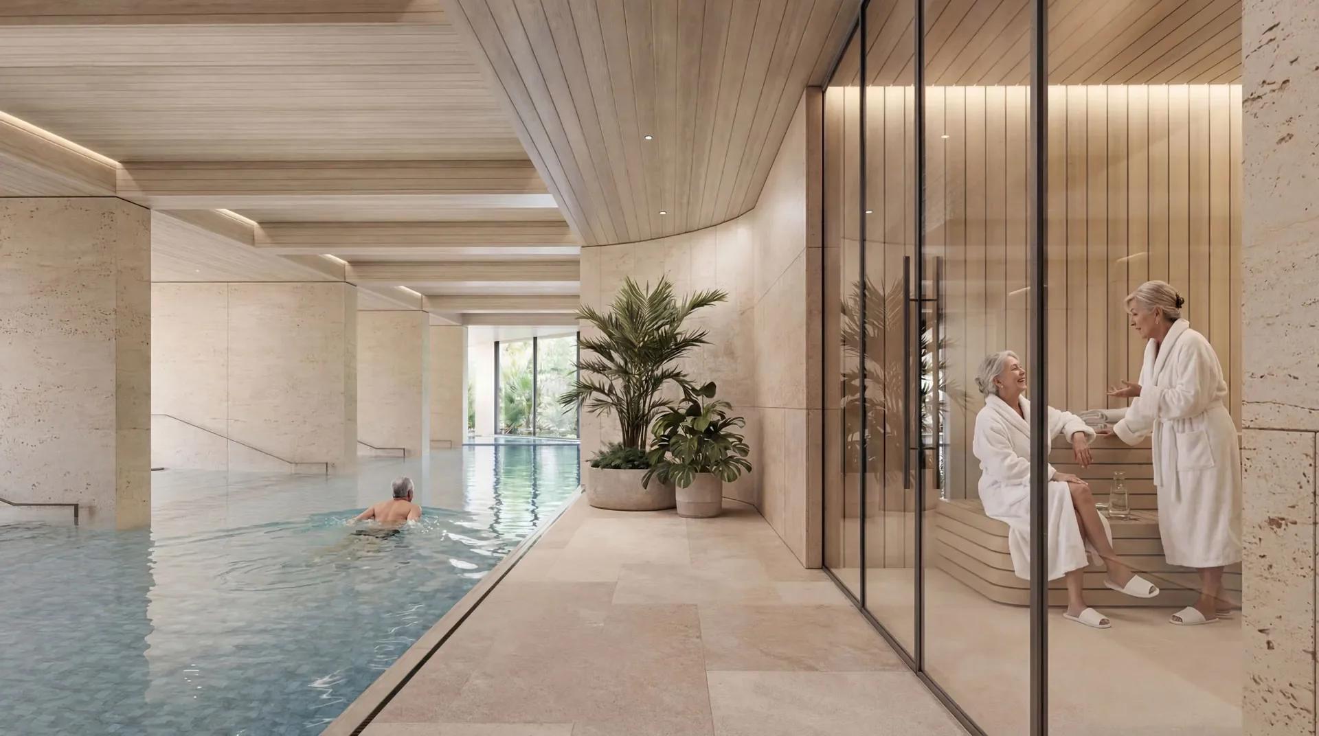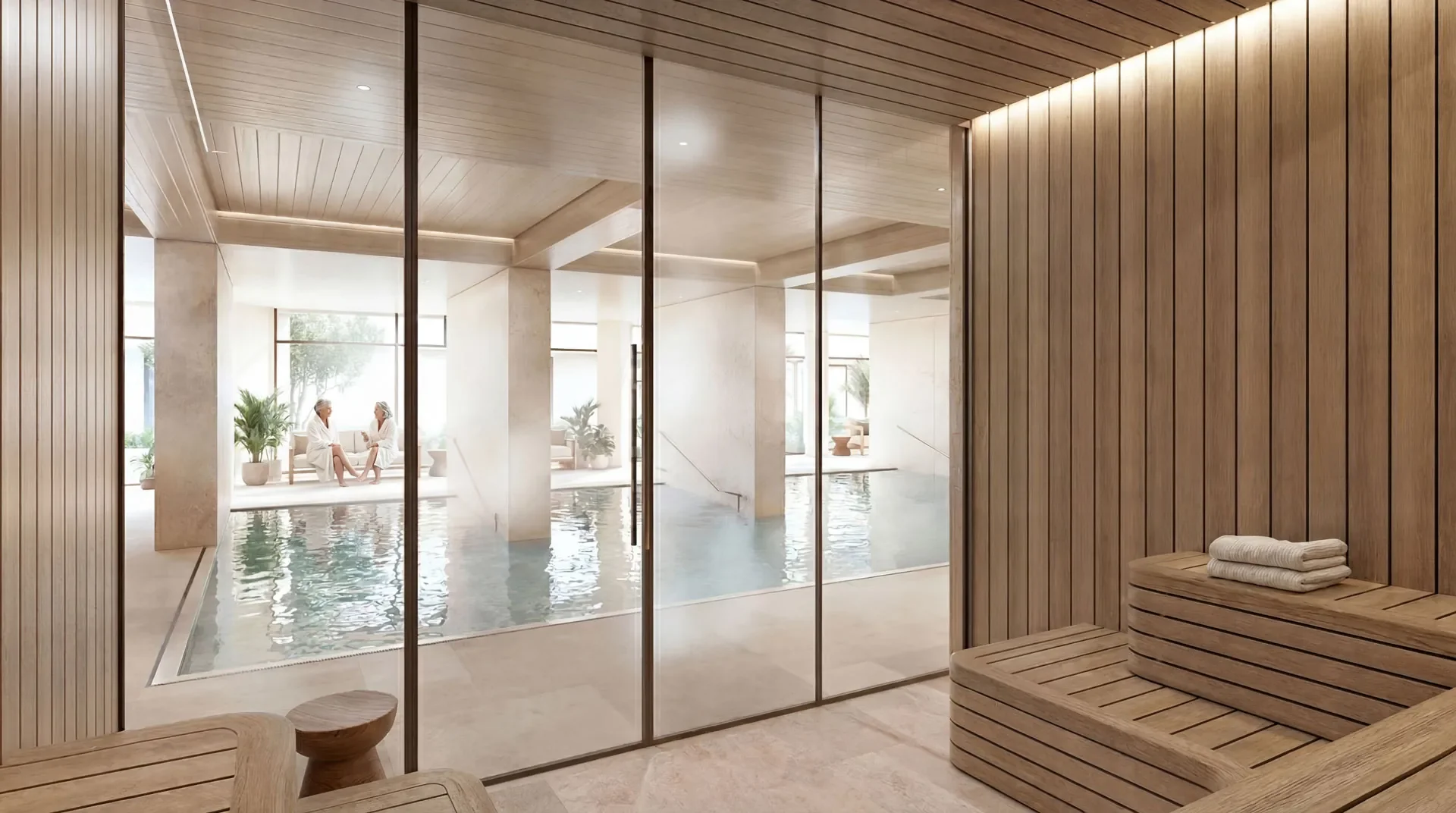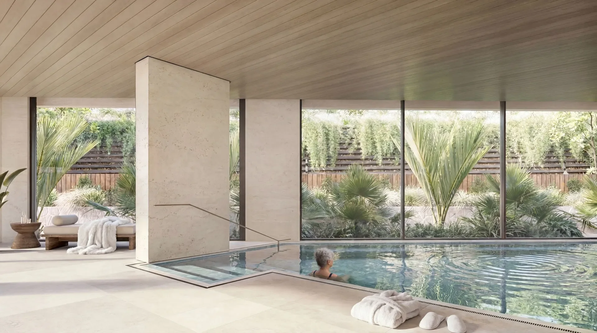 ELEGANT SPACES — DAILY RENEWALElevate your wellbeing in surrounds that inspire movement and restore balance. Floor-to-ceiling glass, oak detailing and honed stone surfaces create a sense of calm — inviting you to energise yourself for the day.